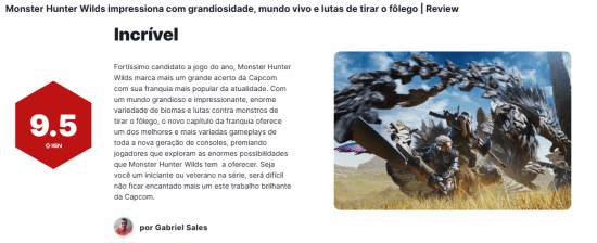 除此之外,IGN巴西分部对《怪物猎人:荒野》打出了9.5的高分评价。