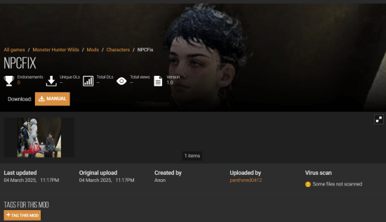 据外媒博主消息,知名MOD网站Nexusmods近日针对《怪物猎人:荒野》的MOD进行了处理,其中一款MOD“NPCFix”引发热议。