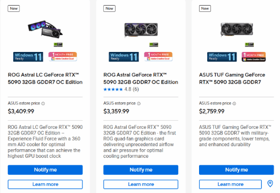 最新案例是华硕,该公司再次大幅提高了RTX 50和RX 9070系列显卡的价格。据了解,2月初,华硕GeForce RTX 5090 Astral OC版显卡在华硕官网的标价为3079.99美元,而现在已涨至3359.99美元(约24322元),一个月内上涨了280美元,比MSRP高出约1.68倍。此外,TUF RTX 5090 OC 版也上调了价格,尽管涨幅相对较小(仅10美元),但其售价依然高达2999美元,约为MSRP的1.5倍。