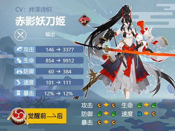 阴阳师sp赤影妖刀姬总体来说还是值得培养的,sp御馔津是个纯粹的功能性式神,有着三S双A属性,能够实现干扰对手,辅助队友,一个人承担了两个最为核心和关键的功能性式神,一驴两吃,非常适合培养。无关从攻击S、生命A、防御S、速度A、暴击S,都是非常好看的三S双A的面板,天生就拥有极大的优势,不过攻击S方面的数值并不算好看,不过3000 出头而已。防御倒是挺不错,速度A是109点也算是正常水平吧。其他面板没有太多亮点。总的来说SP御馔津继承了其原本SSR一样的优秀面板。