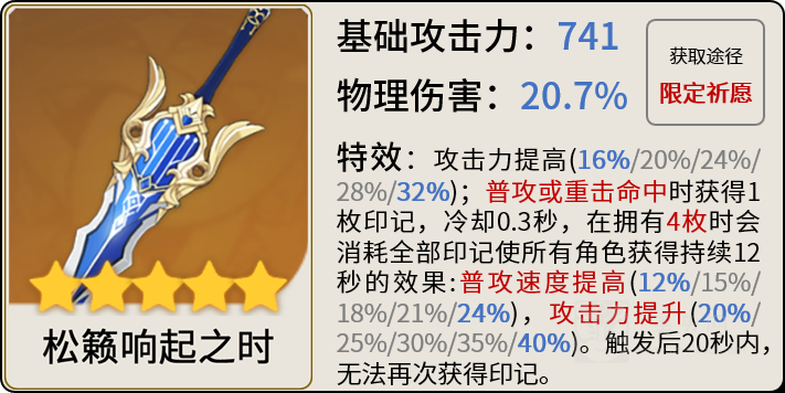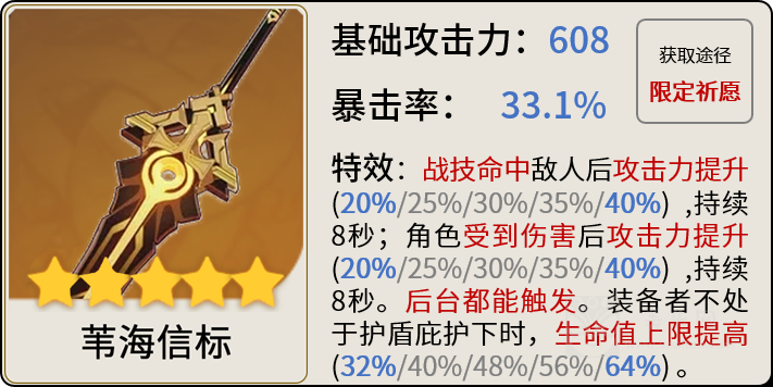 提供攻击力加成和额外攻击力,在五星武器中算是比较容易获得的,歪到这个武器的话也可以用。