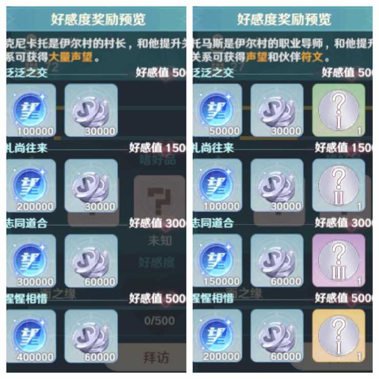 每个NPC都会有3种喜好品,在我们赠送了该NPC他喜好的物品后,图标会从【?】状态变为NPC喜好品的图标,当图标被点亮以后,我们再赠送同类的道具就会额外获得50%好感度加成。