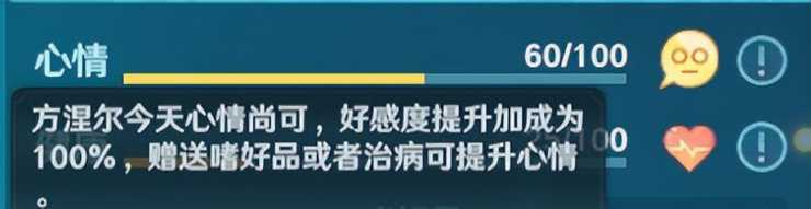 PC的喜好品可以增加5点心情,宴请NPC会根据宴请的宴席不一样而增加不同的心情,而当NPC健康小于20时,就会出现需要玩家医治的情况,医治好后才可以进行交互,而且医治好后会大幅增加心情值,毕竟有人送喜欢的东西,有人请吃饭,有人在你生病的时候送你药的话,都是会让你心情舒畅的事情。