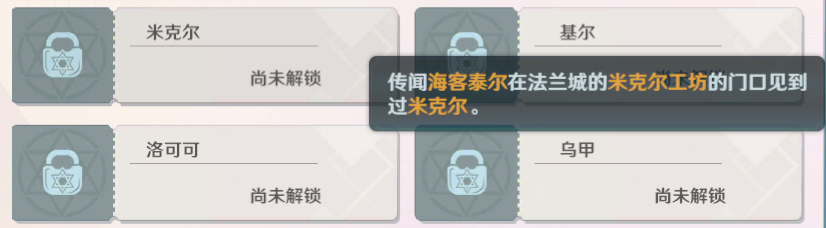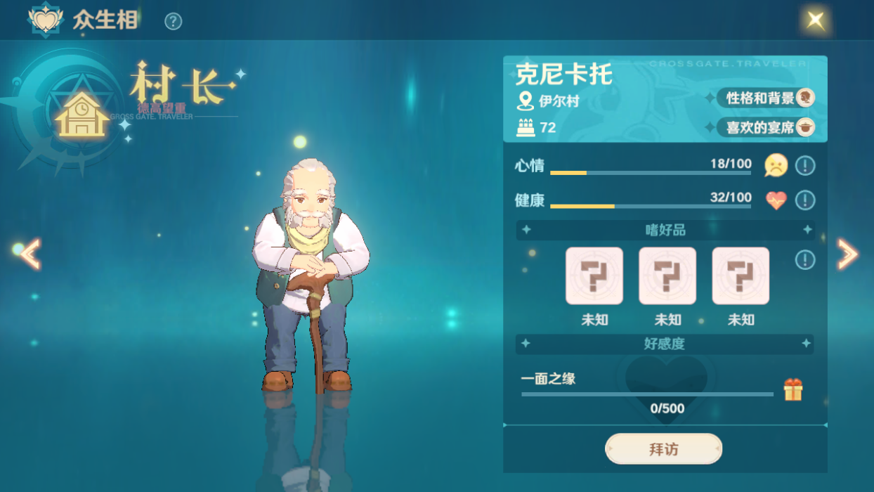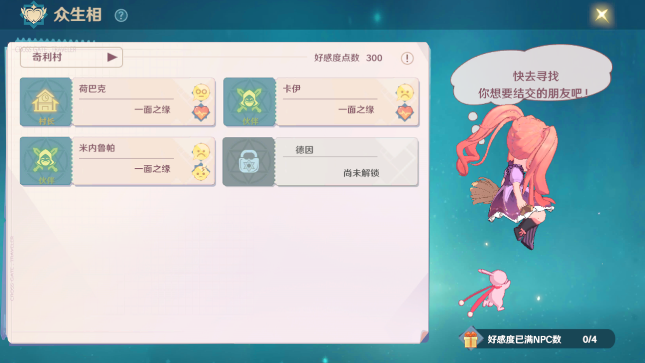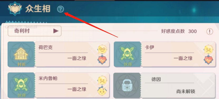 功能开启后,众生相的头像都是灰色的,是处于未解锁状态的,我们首先要做的是找到对应的NPC,和其对话,解锁和该NPC的好感度,用通俗的话说就是:先刷个脸熟。