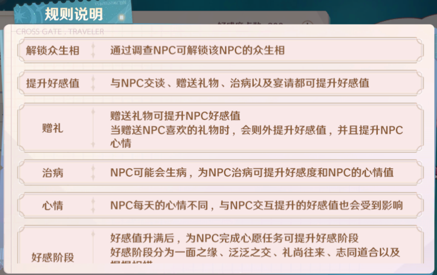 在每天5点时候,会随机刷新当日NPC的心情,心情最大值为100,最小值为1(不太确定,因为没有注意过是否有0的情况)。心情在某一区间段时,会影响我们获得好感度的数值。