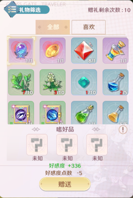在这个界面我们可以选择任意一个道具,进行赠送操作,当我们选择物品后,下方会显示赠送该物品可以获得好感度,如果我们曾经赠送过该NPC喜好的物品的话,则会在物品左上角显示一个爱心标识,同时也可以进入【喜欢】页卡中直接找寻同类物品进行赠送。