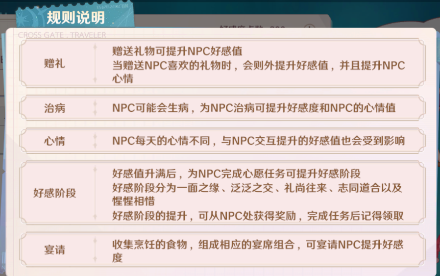 获得好感度的方式有4种:赠礼、交谈、宴请、医治。