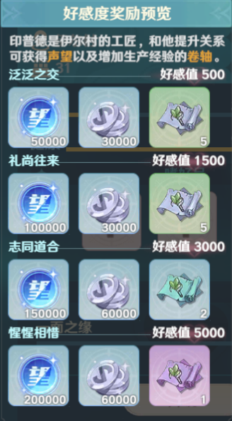 4、熟练度卷轴奖励:显示标识为工匠的NPC在提升好感度阶段时,会赠与玩家与NPC相对应的生活技能卷轴。