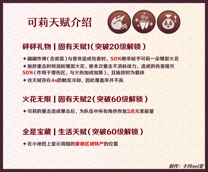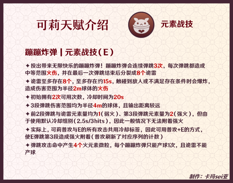 ✦适合触发部分元素反应。可莉重击附着与伤害机制非常契合蒸发反应,且伤害范围也较适合触发烈绽放,但利用这些往往会导致总的天赋利用率欠佳。