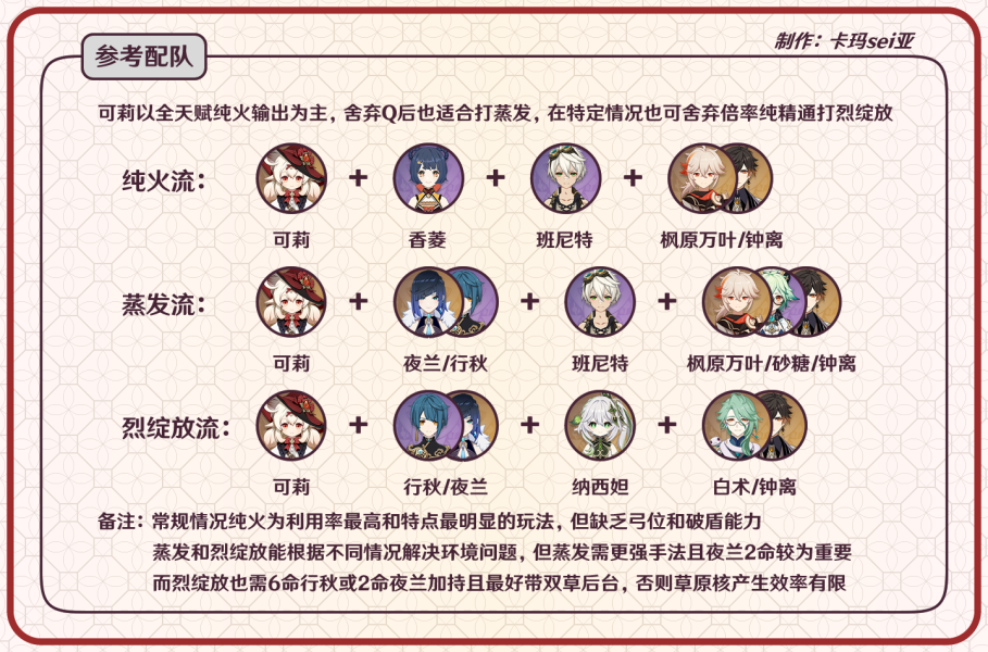 本篇根据各流派对可莉天赋的利用程度,分别介绍纯火流、蒸发流与烈绽放流。