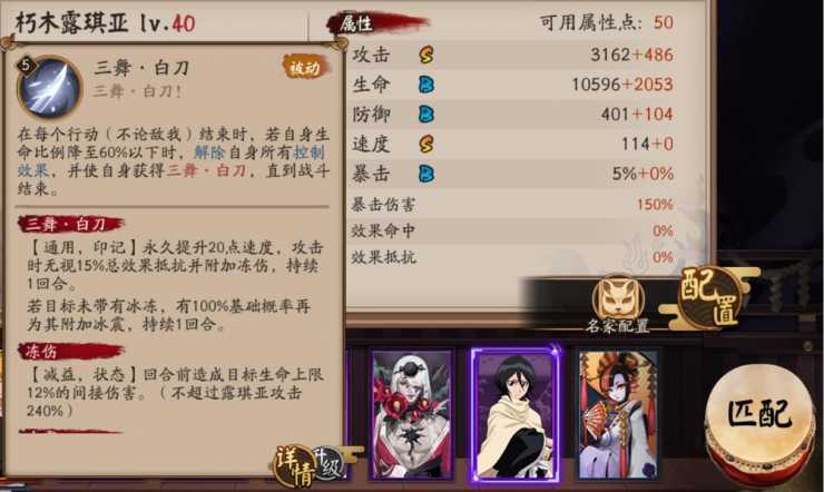 解读:60%血量之后被动开始发力,露琪亚基本上就处于免控了,所有的控制对其基本上都无效,毕竟是不分敌我行动回合都进行判定。这个提供的BUFF大幅度加强了露琪亚的速度、控制几率还有输出能力,也就是说露琪亚在血线下了60%以后基本上算是一个常规输出+控制的SSR式神,