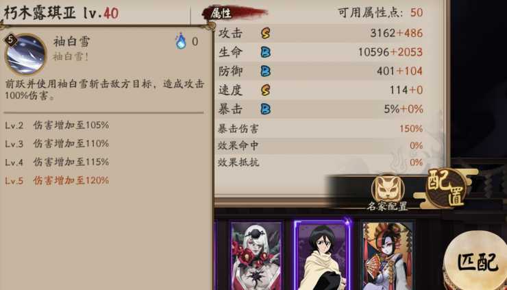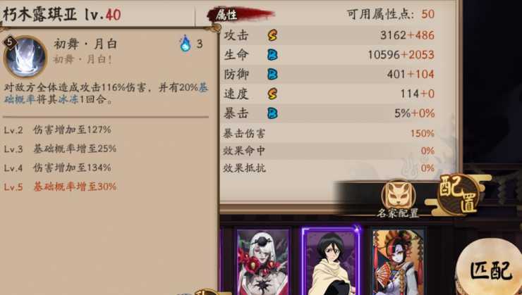 先看面板,攻击S、生命B、防御B、速度S、暴击B,面板还不错,生命防御和暴击够用了,而速度方面非常的快,高到114,攻击面板3162够用了,满足基本的输出需要