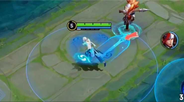 那么脸贴脸到什么程度呢?大家看我们的技能指示器当中还有一个小箭头,只要这个小箭头尾端触碰到敌方英雄,这个时候你起跳就可以有两层被动。