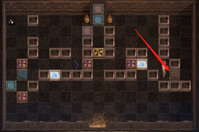 3、先将蛇引诱到图中的凹槽中,然后将红白色方块向左推,进去碰深蓝色方块。