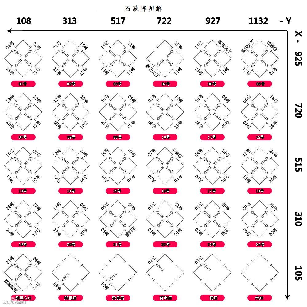 石墓阵,一直往一个方向走即可回到特定房间。往左一直走,可以回到石墓起点。往右一直走,可以到首饰或是药店。往上一直走,一定可以到石墓阵的武器店。往下一直走,有两种可能,到石墓6层或者服装店。