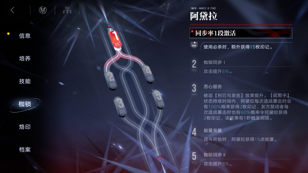 1、想要充分维持阿黛拉的暴击伤害,4技能最高提供的80%暴伤就不能断,而想要不断目前来看有3个办法,其一是1枷锁+带【重逢之日】烙印套装,基本上就能维持印记用完前第二个大招已经恢复好了;其二则是如果不带【重逢之日】,但有3枷锁+队友暴击的辅助,基本上也可以维持印记不会用完;其三则是如果印记要用完了,但下个大招还遥遥无期的话,此时可以立刻将阿黛拉移动出攻击范围,等待下个大招回复好后直接用大招移动回到攻击范围刷新印记即可。