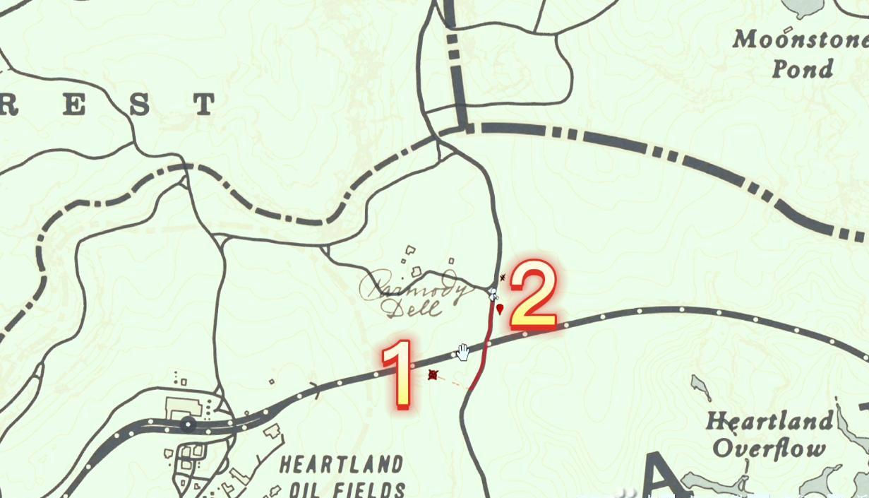 我们骑马来到图中的1号位置,然后看向右上方一点,也就是图中位置2,2这个地点就是该随机任务刷新的地点。
