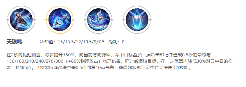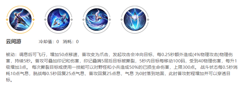 当能量气息满格时,云中君可展翅飞翔,自身将增加50点移速并能够免受地形阻挡。飞行模式下的云中君去攻击敌方英雄的时候,普通攻击就会转变成为爪子攻击,瓜子一是可以提高伤害性,二是只要触发被动,敌人在离开之后,自身还会不断受到被攻击效果出现。印记叠满五层后将被撕裂,身上则会散发金光,在此期间的5s内,目标单位每移动100码,将会受到一定物理伤害,该伤害会随着云中君等级提升而增加。云中君爪击有一定施法后摇,在近身输出时,通常利用走a来取消。云中君爪击撕裂效果与一技能还会对野怪与兵线造成额外伤害,清野带线能力十分优秀。