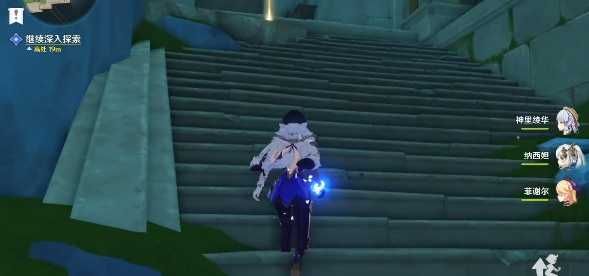 11、对话结束之后需要跟着任务指引游过去,然后看到下面一个洞需要玩家跳下去,跟着指引走就能看到一个楼梯;