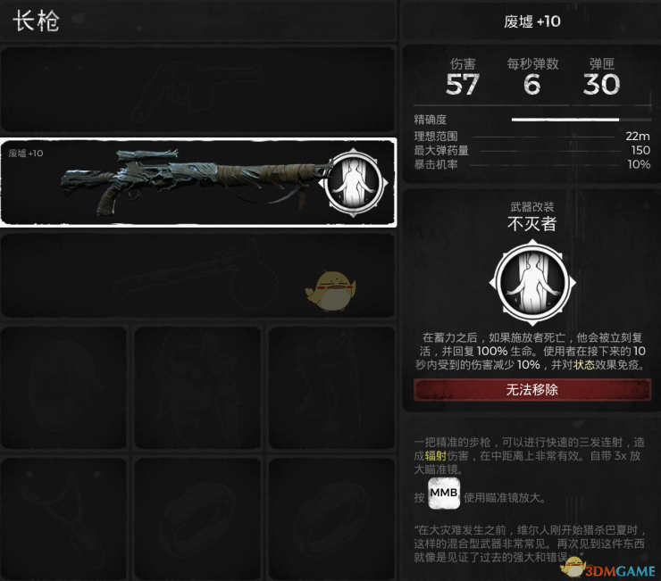 独狼最佳武器苟命枪。伤害不俗,精度很高,弹药量换弹速度非常优秀,也是一把泛用性极强,适用于任何情况的武器。使用上和突击步枪类似都是短点射,但是更高的伤害,精度和弹匣容量。同时由于其基础暴击高于射线步枪,也没有射线步枪低硬直伤害的缺点,使其成为光耀暴击套的第二个选择。自带改装不灭者,单人苟命的最佳选择。充能满之后人物头上会出现图案。此时如果HP归零,则会跪地几秒然后复活。上个版本砍了充能并且复活从回满砍到了一半,这版本看文字说明是改回来了?