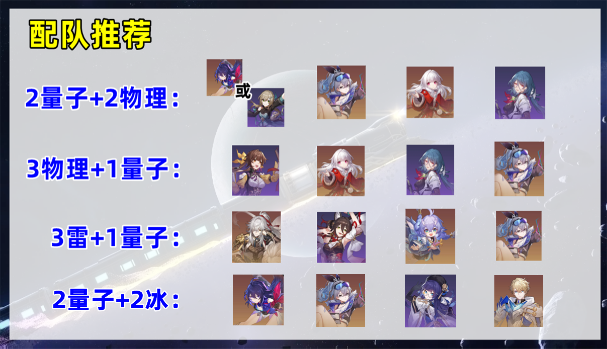 3雷+1量子:景元+停云+白露+银狼。银狼和停云相互补充,能让景元和神君的输出更高。缺点是战技点的分配问题,以及给敌人挂上量子弱点时比较尴尬。