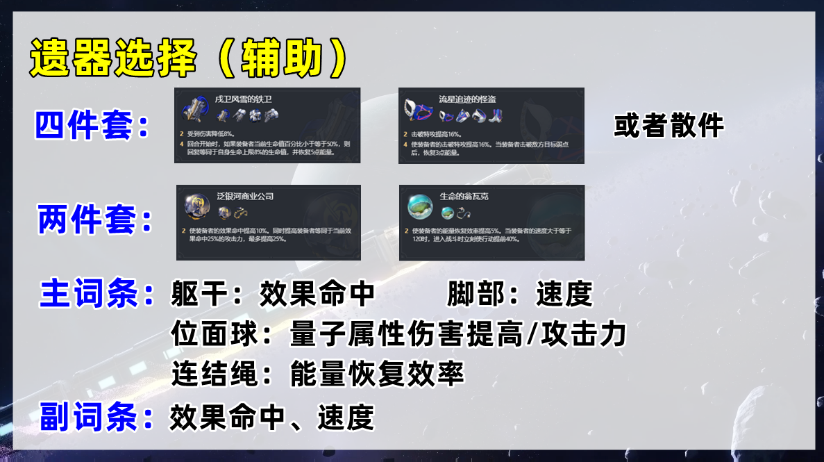 输出路线的四件套推荐量子套繁星璀璨的天才,两件套依然选泛银河商业公司。主词条方面,推荐躯干换成暴击率或暴击伤害,脚部可选速度或攻击力,位面球选量子属性伤害提高,连结绳换成攻击力。副词条推荐先找暴击率和暴击伤害,再找效果命中、速度和攻击力。