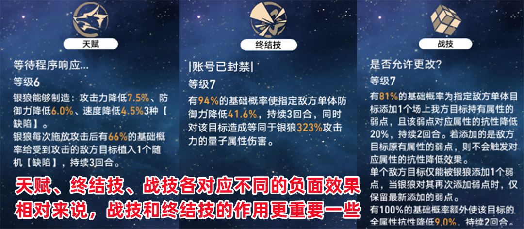 想要尽可能发挥银狼的辅助作用,最好的办法当然是把战技、终结技和天赋都升满。不过目前大家的资源都比较缺乏,推荐先升战技和终结技,提升负面效果的基础概率和减抗/减防的比例;之后再考虑升级天赋,天赋的“缺陷”效果相对来说没有那么明显;普攻则可以不升级。