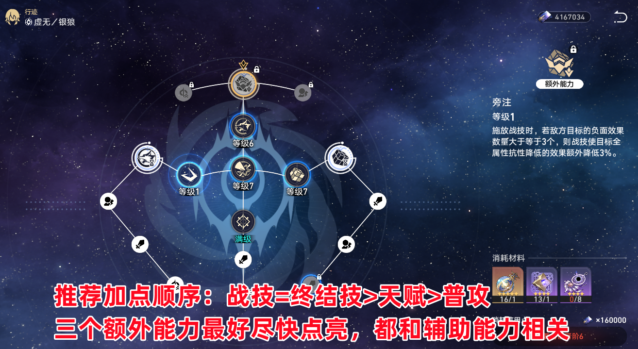 因此推荐加点顺序为:战技=终结技>天赋>普攻。行迹里的三个额外能力也要尽早点亮,因为都能提升银狼的辅助能力。