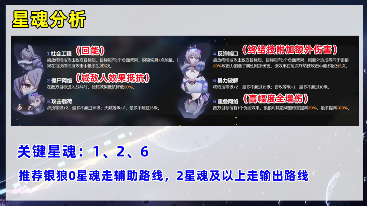综合来看,星魂1、2、6是银狼的关键星魂,星魂6提升最为明显。0星魂的银狼更适合辅助,星魂2及以上走输出路线更优。