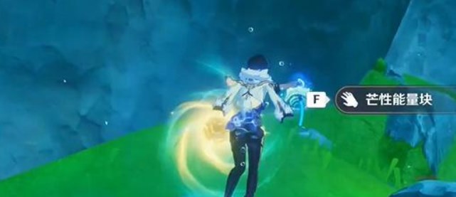 3、接着是前往右侧最高的绿物上拿到蓝球,也就是荒性能量块,收集过后就可以下去了。