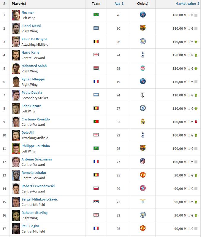 近日德国转会市场更新了最新一期的球员身价评估,并排出了本届世界杯的球员身价排行,内马尔和梅西以1.8亿欧元身价并列第一位,德布劳内、凯恩、萨拉赫以1.5亿欧元身价紧随其后,33岁的C罗身价达1亿欧元,详细内容一起往下看吧。