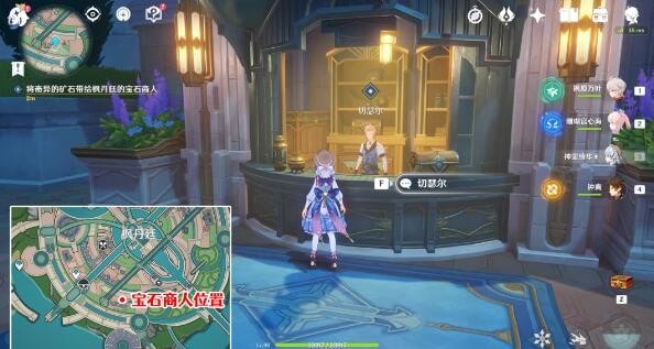 5、带上矿石传送到枫丹廷内部图示位置的传送锚点,沿路往东南边走就能找到宝石商人切瑟尔的店,与其对话即可。
