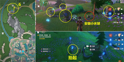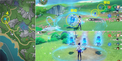 1.第一处位于【秋风山西侧】,将附近三个水球拾取后放置激活水圈,将水圈携带激活剩余两个水元素机关解密获取宝箱;