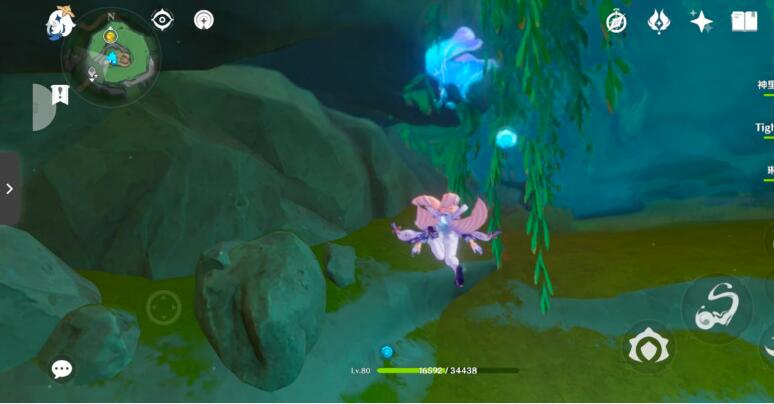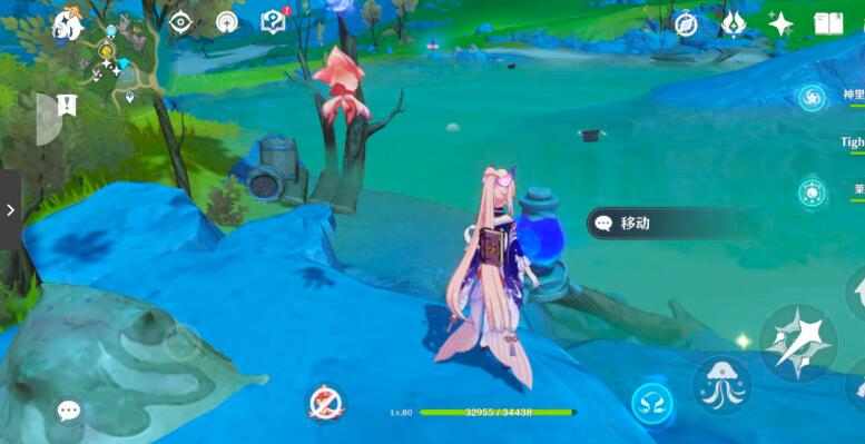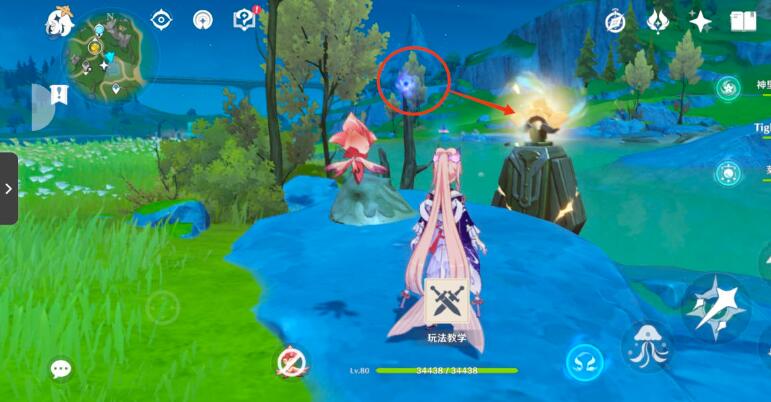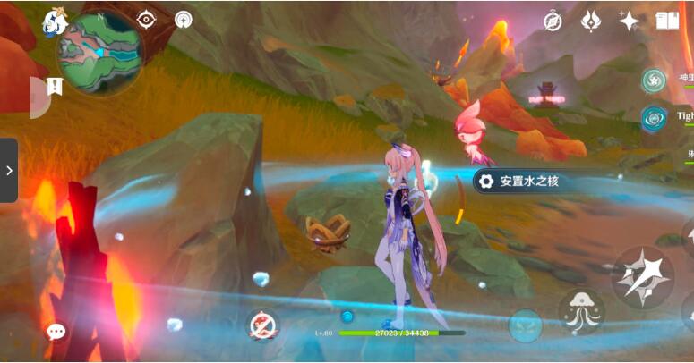 10、以上锁的元素方碑为参照物,从右边可以找到一个单独的水之核,角色在水元素附着的情况下可以使水之核成长为水环,将成为水环的水之核安置。
