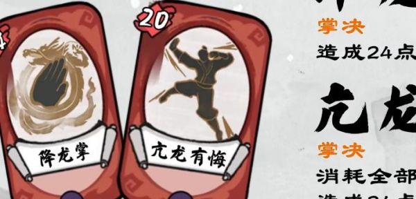 辅助卡牌,神龙摆尾和降龙回天。神龙摆尾,没什么好说的,就是给玩家们增加额外的伤害而已,可以对玩家们招式造成的伤害,提升八点,要累积使用。主要还是降龙回天,需要丢弃一张招式,然后获得两招会消耗的招式的飞龙在天。经典的弃一抽二,可以帮助玩家们能够更快的进行运转。在开局没有飞龙在天的情况下,降龙回天能帮助玩家们进行招式的补充。