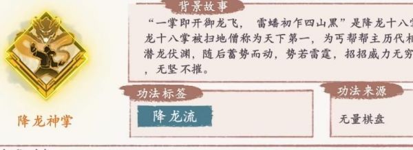 降龙流,取自于经典金色技能降龙神掌。一掌即开御龙飞,雷蟠初乍四山黑。作为武侠经典神级功法之一,降龙神掌或者说降龙十八掌一直为丐帮帮主代代相传,招招威力无穷,有如雷霆无坚不摧。