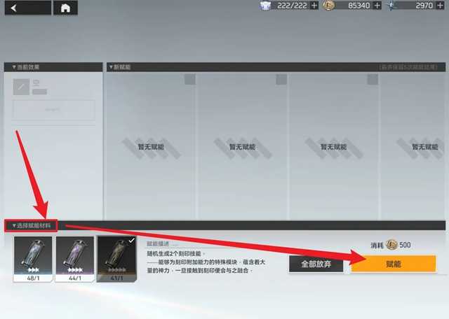 选择附能材料并点击右侧【赋能按钮】完成赋能,附能材料有三种品级(蓝色、紫色、金色),品级越高赋能的初始等级也就越高。