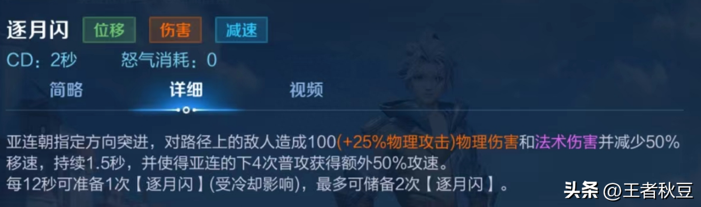 细节②:二技能每12秒存一次,可以存2个,受冷却影响,满级8秒一个。由于亚连几乎没有冷却出装,即便满CD,也要4.8秒一个。在一般没有CD的情况下,二技能冷却很慢,不要有了就用,尽量保持手里有一发二技能,保证后续的断一技能,或者追击逃跑,提升后续操作空间。
