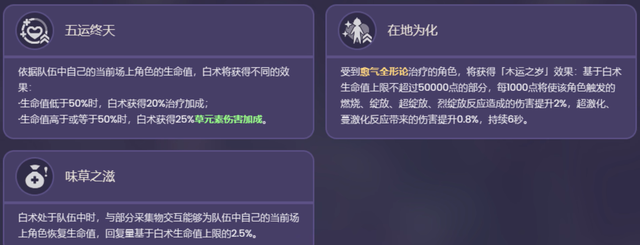 看下白术的固有天赋也是不错的,五运终天效果为队伍中前台角色生命低于50%时候,治疗白术自身20%血量,队伍中前台角色生命高于50%,白术获得25%草元素伤害加成,固有天赋在地为化,效果就是白术开大招,前台角色受到基于白术生命值上限不超过五万的部分,每1000点将使该角色触发燃烧、绽放、超绽放、烈绽放反应造成的伤害提升2%,超激化、蔓激化反应带来的伤害提升0.8%,持续六秒,两者最大值可提高100%和40%,还要个固有天赋在大世界中比较舒服,与部分采集物能为自己当前场上角色恢复生命。