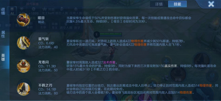 夏侯惇生命值低于50%并受到伤害时,每次普攻和技能命中都会回复自身血量,持续8秒。冷却时间30秒