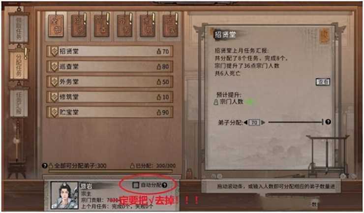 当上宗主后,第一件事就是把任务自动分配给关了!!!游戏的自动分配任务做的很差,宗门交给系统管理,完全就是摆烂,就算你管理的再好的宗门,系统分分钟把你弄到破产!!