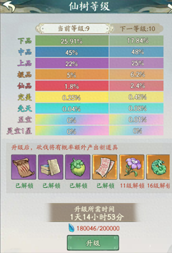 升级仙桃需要大量的灵石,但是这是获得属性加成,以及获得更多游戏资源的唯一途径,仙树的等级越高,解锁的随机掉落资源也就越多。