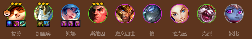(1)阵容成员:提莫、加里奥、娑娜、斯维因、嘉文四世、慎、拉克丝、克烈、波比
