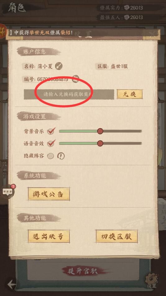 3、在设置界面中,您将找到兑换码的输入位置。