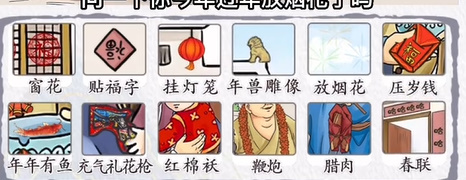 答案:窗花、贴福字、挂灯笼、年兽雕像、放烟花、年年有鱼、充气礼花、 红棉袄、鞭炮、腊肉、压岁钱、春联