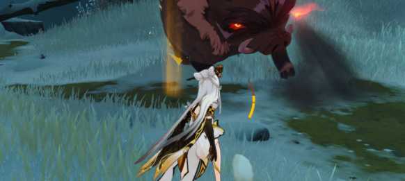 大雪猪王短暂蓄力后向玩家发起冲锋,可以打断玩家动作并击飞,造成伤害。