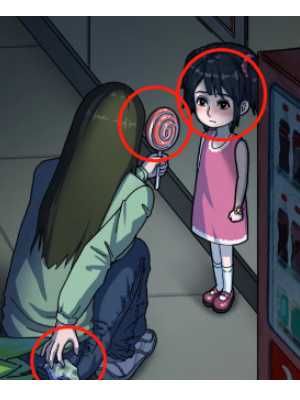 1、进入游戏我们看见一个大人递给女孩棒棒糖,我们需要找出图中不对劲地方(图中女孩的表情,大人一手拿着棒棒糖,一只手放在背后手上拿着手帕)。这时大人突然带着恶鬼面具当着我们面将小女孩抱走。