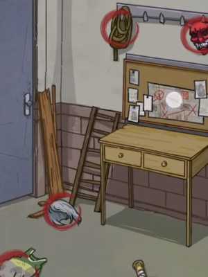 4、我们根据线索找到木屋,在木屋里我们找到墙上挂的绳子和恶鬼面具,地上是老人的假发,一件小孩的衣服,折断的棒球棍,移开墙上绿布出现人贩子的规划,打开抽屉发现人贩子准备的小孩资料。