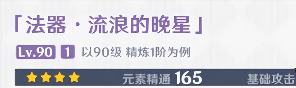 原神流浪的晚星是四星法器武器,90级精炼1阶属性为165元素精通和510基础攻击力,为限定四星武器,非常适合砂糖,装备特性为每10秒基于装备者的元素精通的24%,提升该角色的攻击力,并基于该提升的30%为队伍中附近的其他角色提升攻击力,持续12秒。