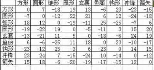 阵型相克:方克园,圆克雁,雁克锥,锥克方;箭矢克方,鱼丽克方,方克矩,矩克玄囊,玄囊克锥,锥克方。